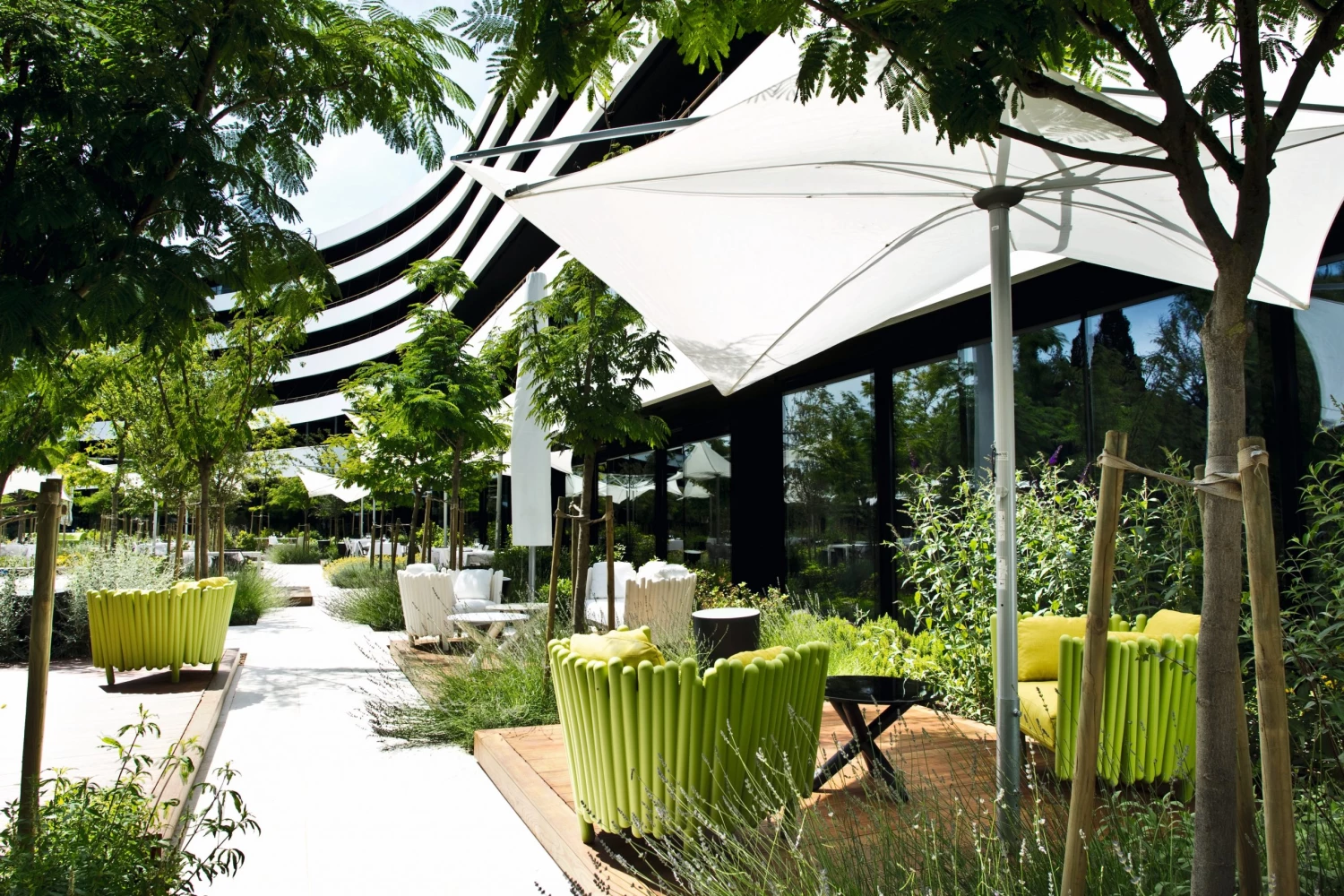 “”On the shores of the Mediterranean, rushes, wild plants with long flexible stalks grow, rocking in the wind, resisting. These thin plants are harvested and tied up to create trellises used for protection from sun, wind, and eyes. These “”cannes de Provence””, transformed into partitions, “”les canisses””, are conjured up in this outdoor seating design, using their simple and irregular appearance.