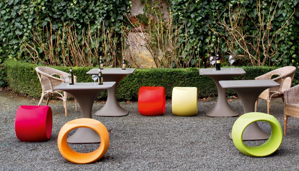 Cero stools are informal seats made of polyethylene, characterized by lightness and defined by their open shape.