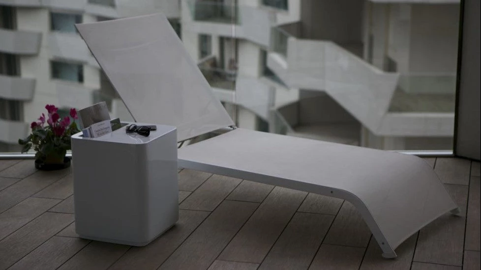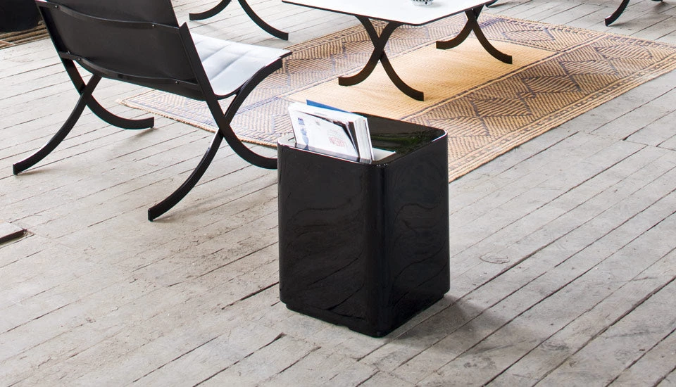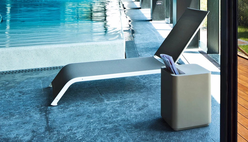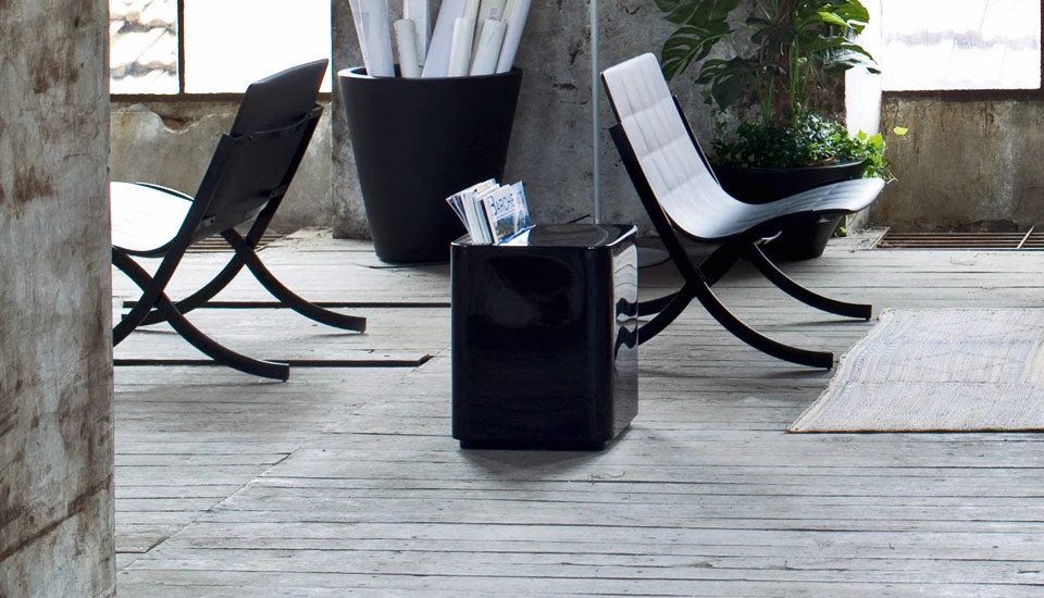 A versatile piece of luxury furniture that can blend with various environments according to its finishing: a basic version with a natural finish or a more sophisticated option in a lacquered finish. The slot designed to accommodate books and magazines has a small outlet in the bottom that allows water to pass through, so this magazine rack can stay outdoors all summer.