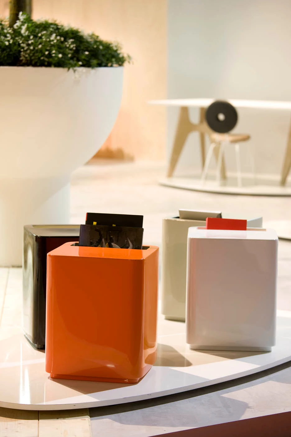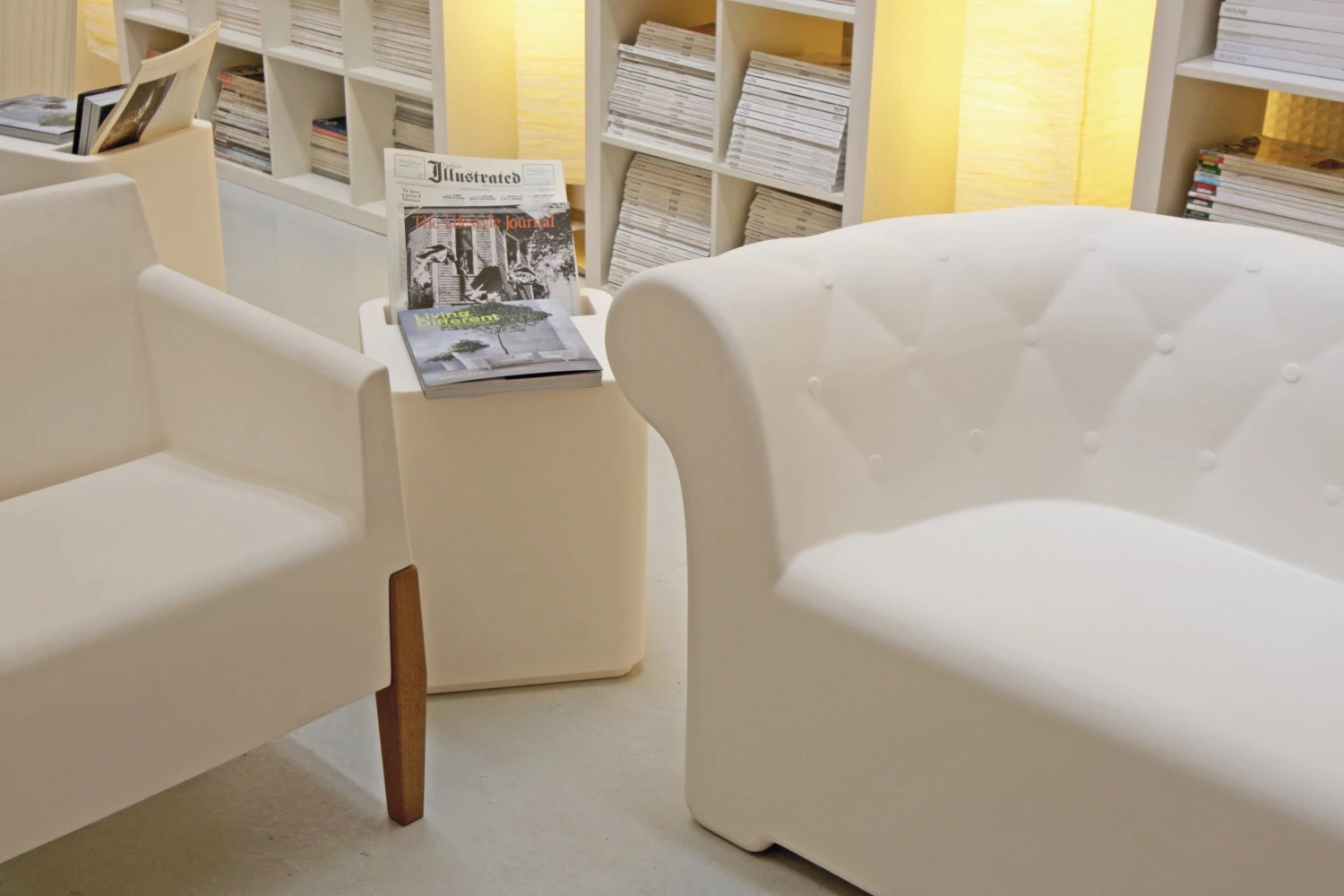 A versatile piece of luxury furniture that can blend with various environments according to its finishing: a basic version with a natural finish or a more sophisticated option in a lacquered finish. The slot designed to accommodate books and magazines has a small outlet in the bottom that allows water to pass through, so this magazine rack can stay outdoors all summer.