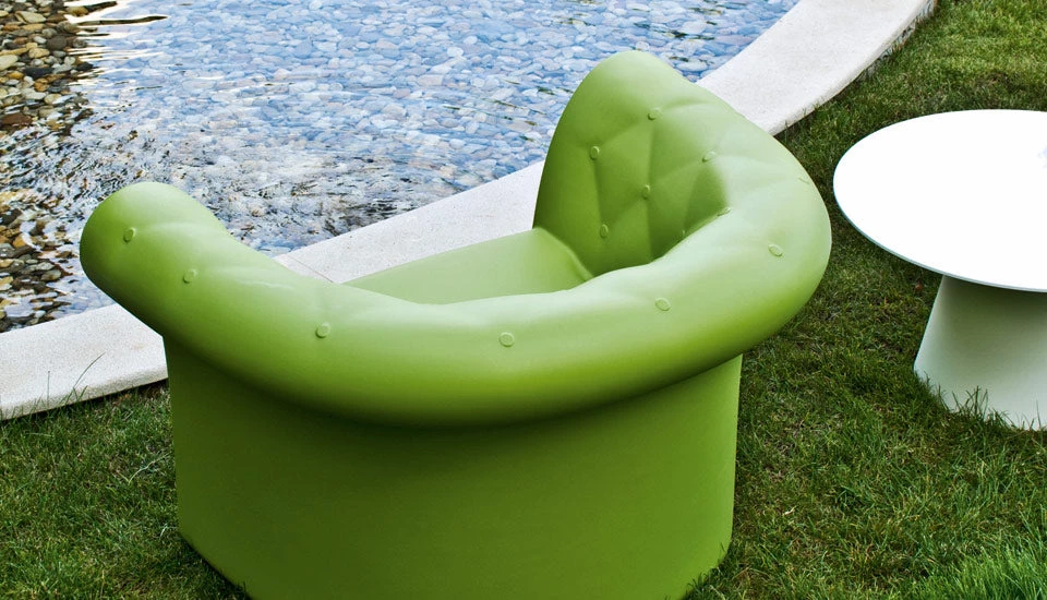 The initial concept was very clear: that of creating comfortable and functional outdoor sofas. Synergy between design and shape was made possible thanks to the know-how of the Serralunga company that, through rotational technology, created an evocative shape able to retain special features, like the padded effect, of the original English armchair.